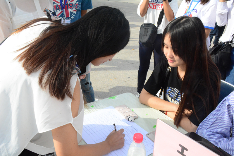 早上八点,于我校天佑会堂前举行了返校校友签到活动。我校校友会工作人员有序地为校友分发毕业五周年纪念品。随后校友们按照我校精心设计的游园路线"南门–天佑会堂–一期食堂–大学生活动中心–教工食堂–体育馆"进行参观,走故时旧地,览今日风采,忆当时年少,感五年变化。