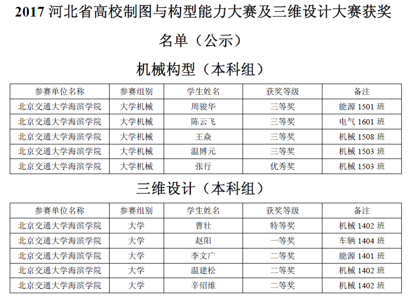 2017年5月20日,河北省制图与构型能力大赛及三维设计大赛在石家庄河北科技大学举办。我校机械与电气工程系10名同学在指导教师孙浩和刘栋老师的带领下,代表北京交通大学海滨学院首次参加了此次大赛,并取得优异成绩。其中,学生个人在制图与构型能力大赛中,获三等奖4项,优秀奖1项;在三维设计大赛中,获特等奖1项、一等奖1项、二等奖3项,同时,荣获三维设计大赛团体二等奖(第六名)。