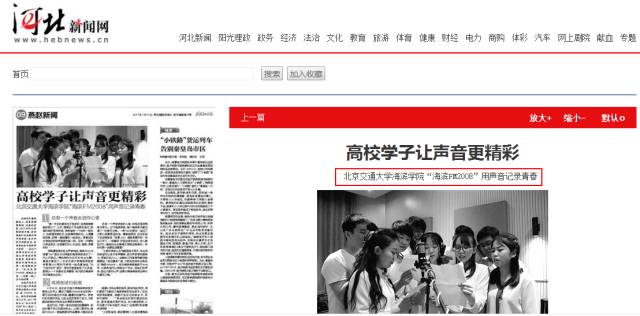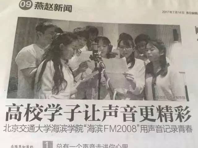 7月14日,由河北省极具影响力的主流强势媒体——《燕赵都市报》大版面刊登《高校学子让声音更精彩——北京交通大学海滨学院“海滨FM2008”用声音记录青春》一文,详细报道了我校全媒体工作室及官方微信平台原创栏目“海滨FM2008”。同时,此文在河北新闻网、青年教育行、《黄骅报》、《渤海新区报》等多家媒体进行转载。