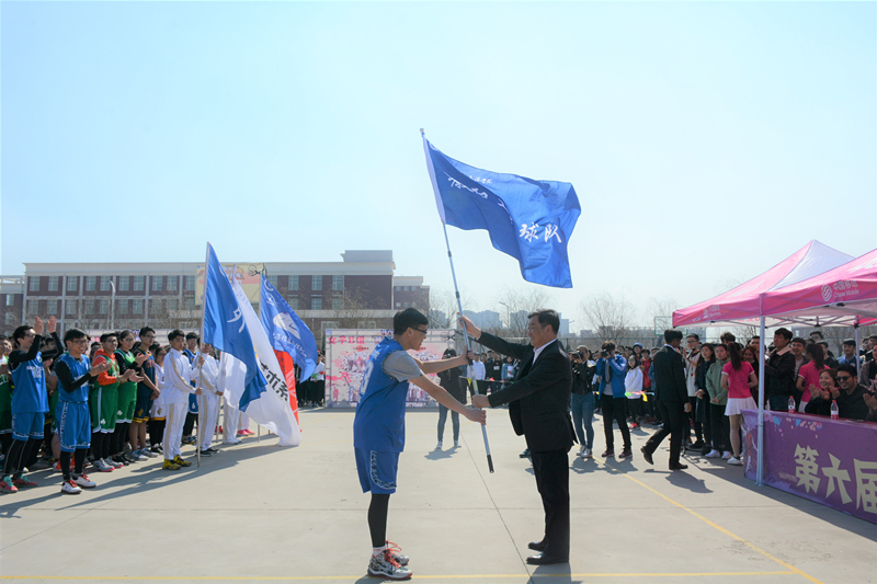 在青春洋溢的开场舞过后,各系学生代表队以及裁判员入场,全体裁判员代表李佳根与全体运动员代表李胤进行宣誓。开幕式上还举行了我校教职工篮球代表队成立仪式,王院长为教职工代表队授旗并为此次篮球联赛开球。此次比赛不仅有强大比赛阵容,而且女子组的参加也成为大赛一大亮点。