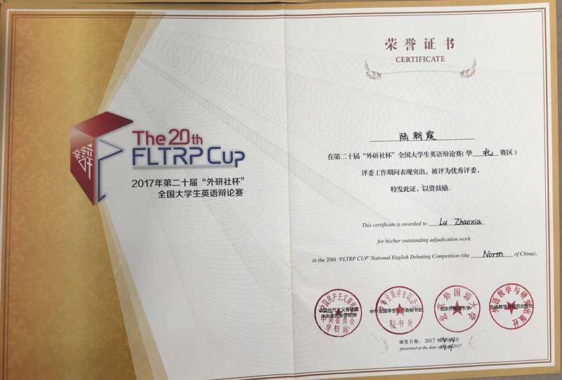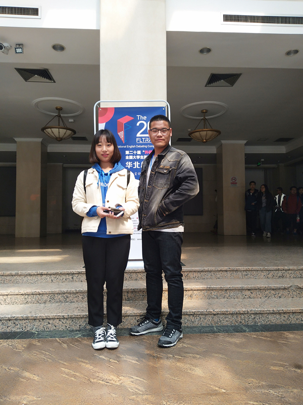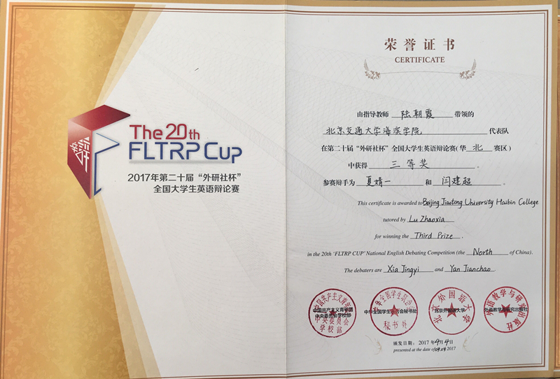 我校选派外语系英语专业陆朝霞老师为指导教师,宋琳琳为领队老师,经过层层遴选,英语专业2015级闫建超与夏婧一同学脱颖而出,代表我校参赛。经过两天的激烈赛事,我校两位辩手宏辞论道,舌战群儒,荣获大赛三等奖,为我校取得荣誉。