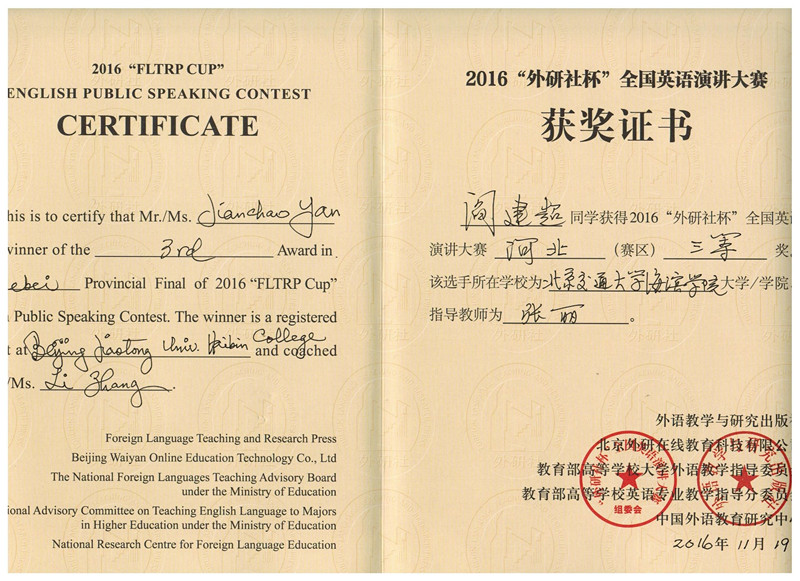 2016年11月18日—20日,河北省高等学校第十七届“世纪之星”英语演讲大赛在唐山师范学院举行,来自全省73所高校的481名参赛选手及其指导教师参加了比赛。经过两天的激烈角逐,最终,我校外语系教师宋琳琳荣获“青年教师组”二等奖,基础教学部大学英语教研室教师孙杰荣获“青年教师组”三等奖,交运系学生刘宇、计科系学生纪应杰、外语系学生闫建超荣获大赛三等奖,基础教学部大学英语教研室主任马玉玲荣获优秀指导教师奖。