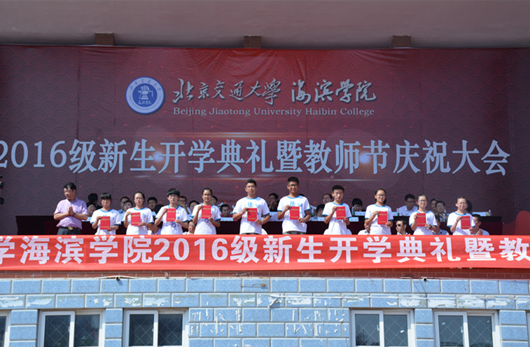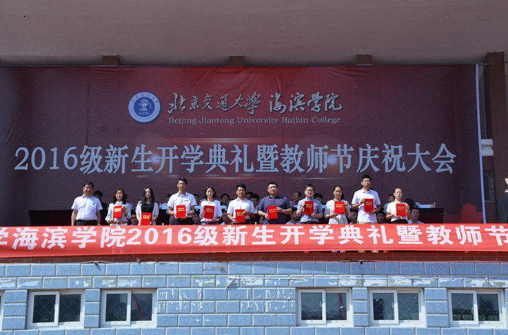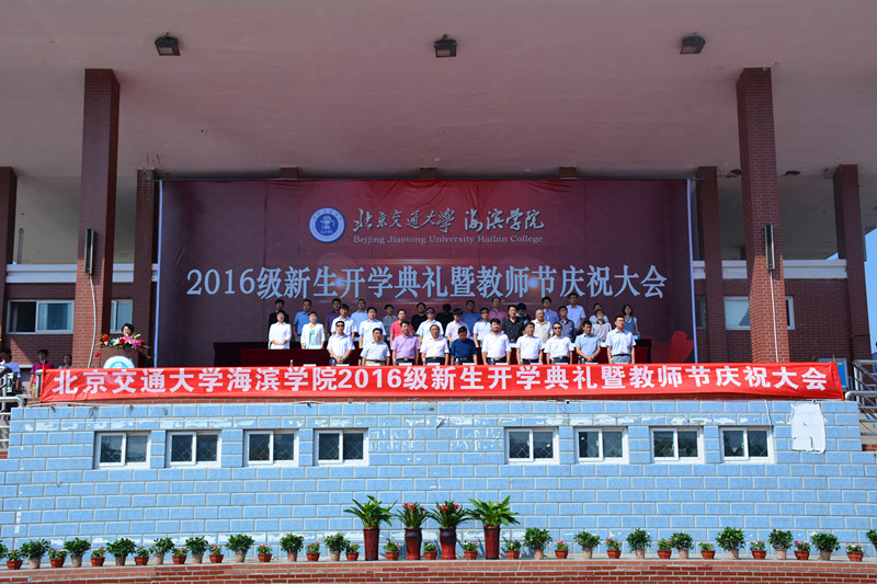 9月8日上午10点,我校2016级新生开学典礼暨教师节庆祝大会隆重举行。北京交通大学党委副书记高福廷,黄骅市人民政府副市长郑增强,祥兴集团副总裁张在兴、薛君南、徐连跃,我院院长、党委书记王化深,副院长、副书记张长铎,副院长张乐乐、薛爱兴、徐爱国,党委副书记魏炜以及各教学单位负责人、各职能处室负责人出席典礼。我校来自25个不同省市地区的3352名2016级新同学在辅导员老师的带领下整齐列队参加典礼。典礼由副院长张乐乐主持。
