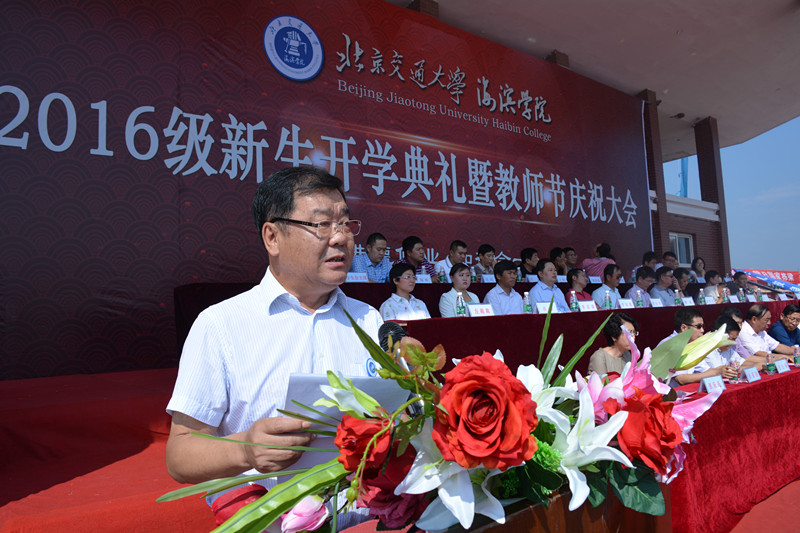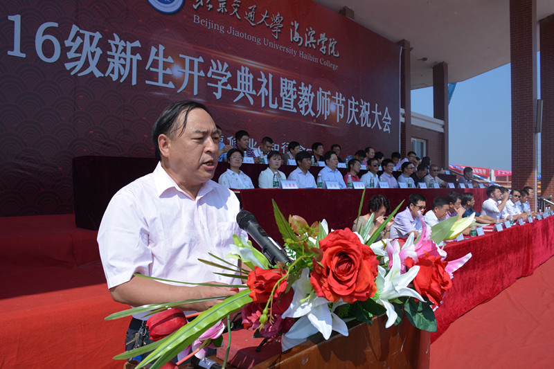 北京交通大学党委副书记高福廷致辞,首先高书记代表北交大向2016级新生表示热烈的欢迎,在第32个教师节来临之际,祝海滨学院全体教师节日快乐!高书记表示海滨学院虽然是一所年轻的学校,但是在师资队伍和人才培养模式上有着自己鲜明的特色,并表示北交大母校始终关心和支持着海滨学院的建设发展,同时热情地邀请同学们在9月10日关注北京交通大学120周年庆!