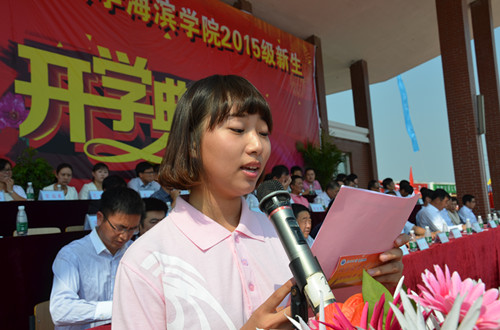基础教学部思政教研室王小红代表全体老师,土木工程系土木1304班孙宇代表全体在校生也分别发言。外语系英语1501班夏婧一同学代表全体新生发言并带领全体新生庄严宣誓。