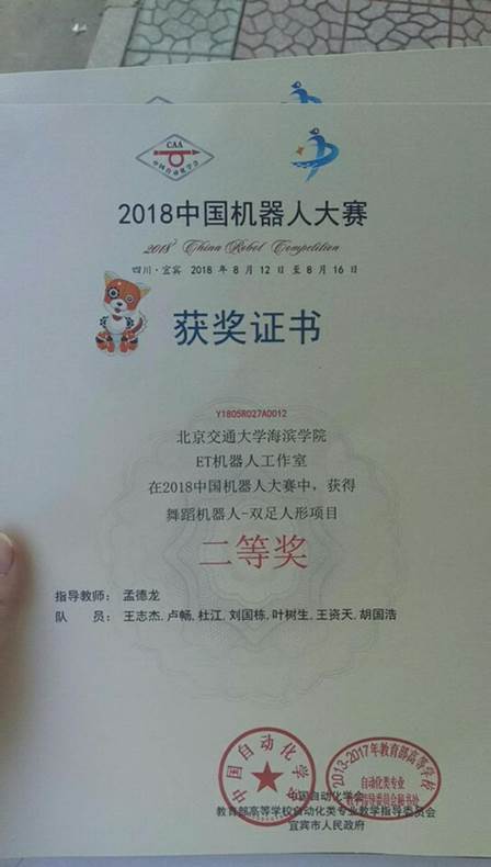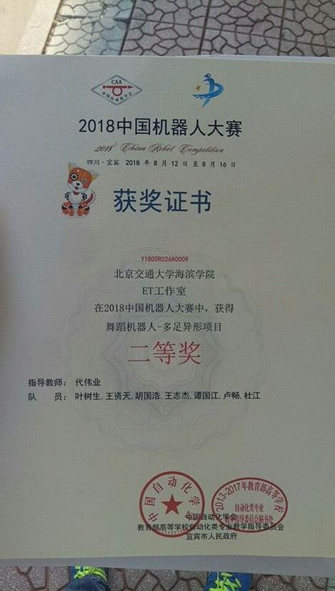 在此次为期4天的比赛中,他们不负众望,获得了2018全国机器人大赛舞蹈机器人双足人形项目二等奖(全国排名12),舞蹈组多足异形项目二等奖(全国排名第9)。感谢老师在炎炎夏日中的陪伴,几分交会,积分得意,几分辛劳,几分收获,没有老师的付出,就没有这份收获;没有老师的教诲,就没有这份得意