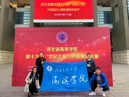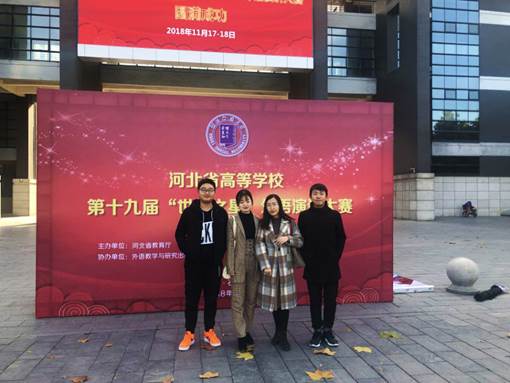 2018年11月17-18日,河北省高等学校第十九届“世纪之星”外语演讲大赛决赛在河北师范大学举行。我校外国语学院贾世娇和郭玉姿带领的参赛队伍参加了本次比赛。来自全省103所高校的411名选手参加了本次比赛。经过两天比赛的激烈角逐,层层选拔,最终我校胡景雯获青年教师组二等奖,王璐瑶获青年教师组三等奖;英语专业2016级学生林佳慧获英语专业组三等奖,电气工程及自动化专业2017级学生张昊文、财务管理专业2017级学生刘博获得非专业组三等奖。