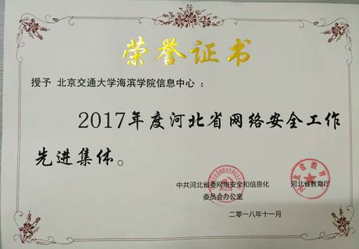年12月7日,中共河北省委网络安全和信息化委员会办公室、河北省教育厅印发《关于表彰河北省校园网络安全工作先进集体和先进个人的通报》(冀网信办文〔2018〕15号)文件,授予我校信息中心“河北省网络安全工作先进集体”、贺秋雨同志“河北省网络安全工作先进个人”荣誉称号。