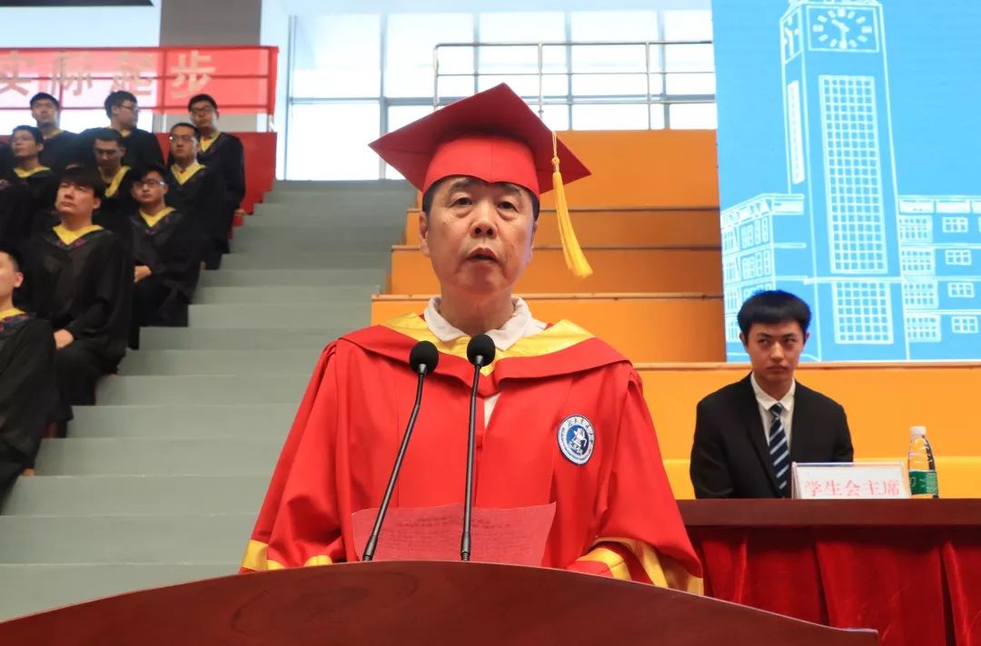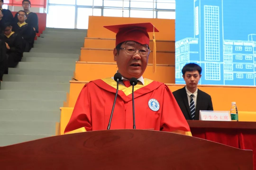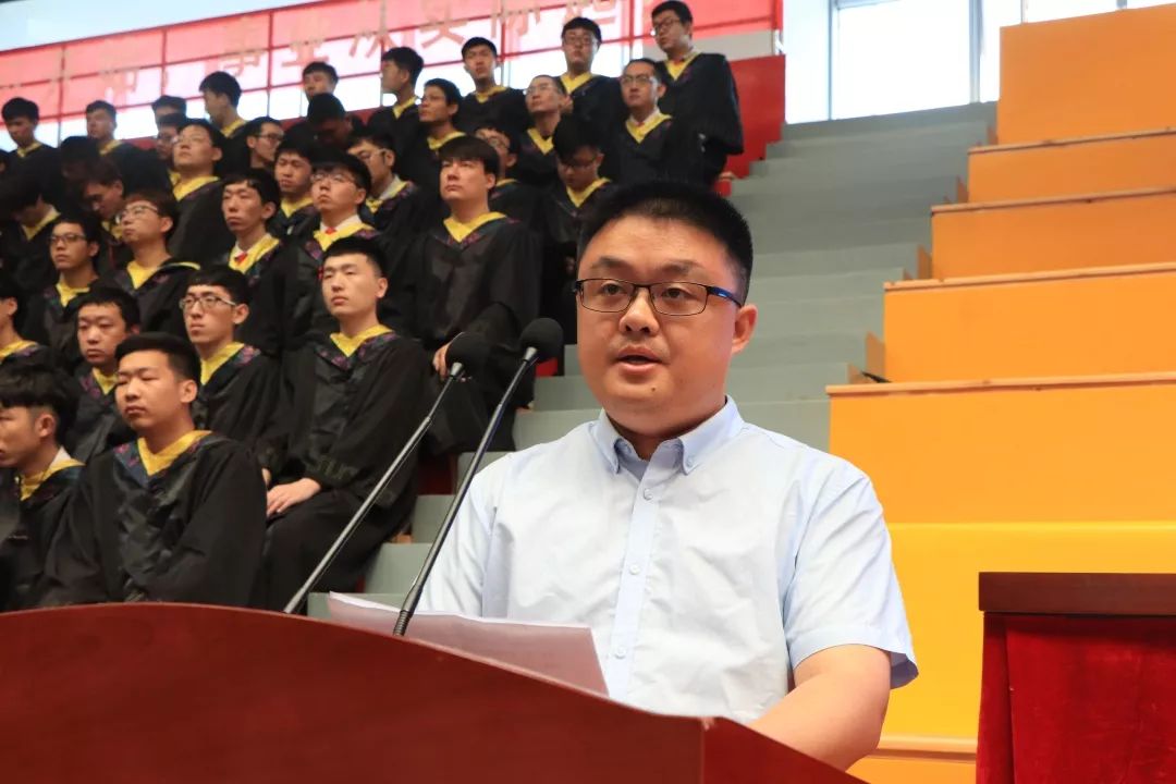 机械与动力工程学院老师代伟业代表我校教师发言,他谈到,希望毕业生们不忘初心,牢记人生最本质的输赢取决于正直、坚毅的品格。