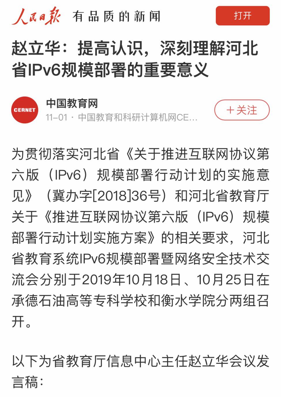 10月25日,河北省教育系统IPv6规模部署暨网络安全技术交流会在衡水学院召开。本次会议由河北省教育厅主办,会上,我校党委理论学习中心组上网信课的做法获得河北省教育厅肯定。