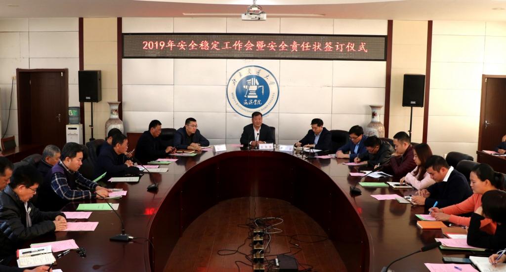 11月14日下午,我校2019年安全稳定工作会暨安全责任状签订仪式于行政楼B512会议室成功举行。我校校长王化深,党委书记魏旺强,党委副书记魏炜,各二级学院(系)、及各职能(部)处室负责人出席会议。