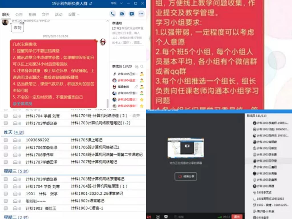 2月24日,我校贯彻落实“停课不停教,停课不停学”,正式开始网上授课,高娟老师统计了能正常参与网课学习的学生名单,询问学生们网课学习是否有困难,征求学生们对网课学习的建议,并通过群投票的方式掌握学生们对网课学习的倾向。为了更好地学习,高娟老师为所在学院2019级所有班级划分学习小组,并将小组名单发给相关任课老师。高娟老师表示,要充分发挥线上实时互动优势,跨越空间障碍,利用线上平台沟通。尤其密切关注疫情严重地区的学生心理状态的变化,适时为学生敞开心扉,答疑解惑,提升学生心理“免疫力”,做学生背后的强大后盾。