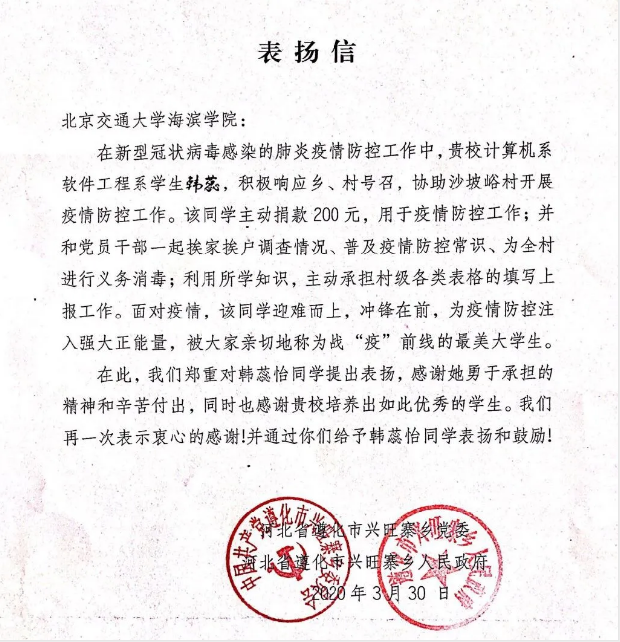 近日,学校收到一封来自河北省遵化市兴旺寨乡党委关于感谢我校计算机与信息技术学院软件工程专业1908班韩蕊同学的表扬信,该生在寒假返乡期间志愿服务为当地疫情防控做出的贡献。沙坡峪村村委评价如下,正是像韩蕊这样的高素质大学生志愿者,筑起了村子的抗“疫”防火墙!