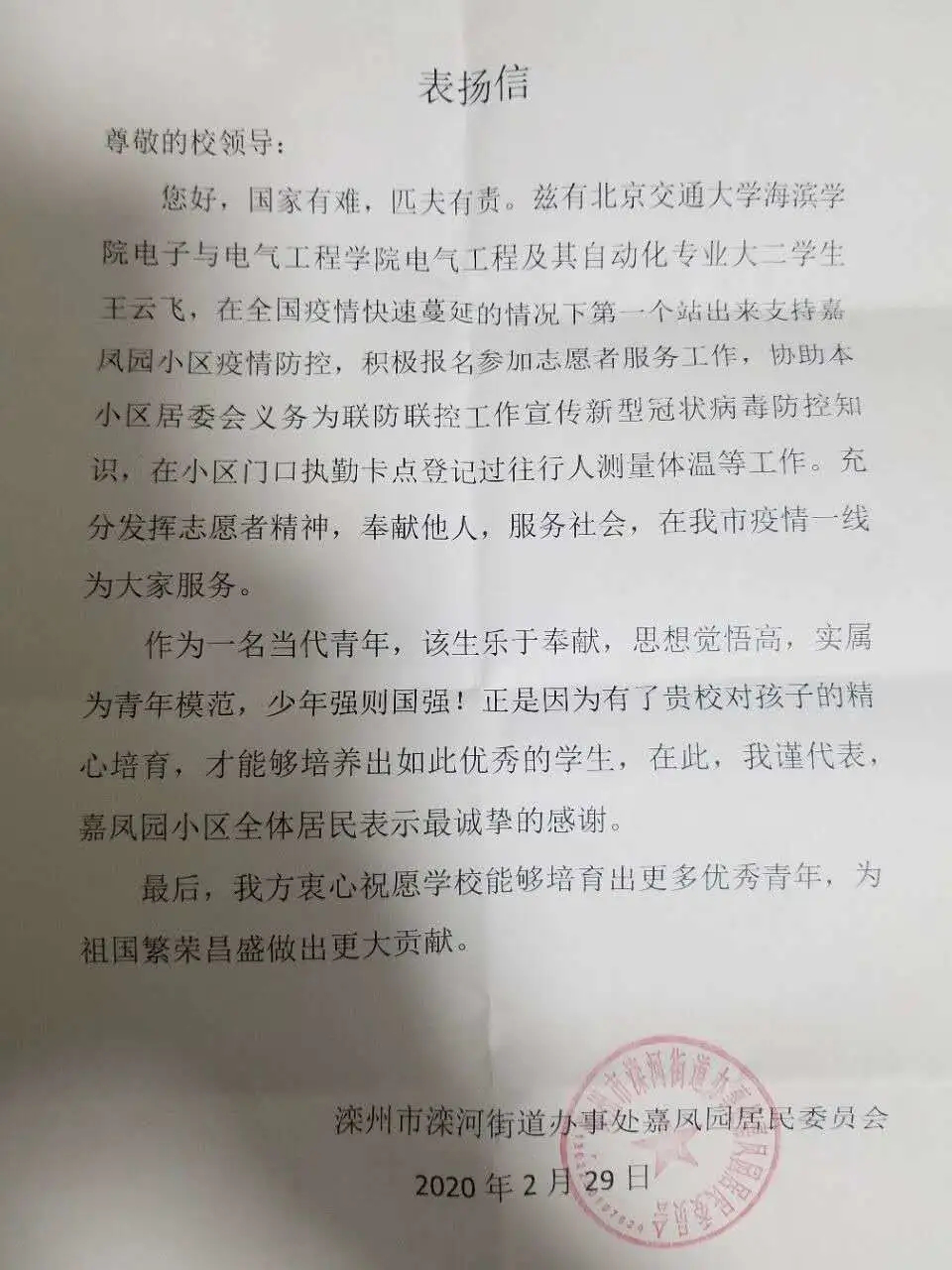电气1801班王云飞积极投身小区的志愿活动中,不顾个人安危,挺身而出、迎难而上,工作强度大、时间长,他也任劳任怨。他用自己的行动展现了当代大学生的青春力量。王云飞表示,白衣天使在前线安心救扶,我等也要在后方尽心守护。我校收到嘉风园居民委员会发来的表扬信,信中对王云飞同学在抗击疫情期间的无私付出表示感谢。