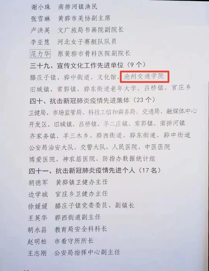 中共黄骅市委、黄骅市人民政府印发《关于表彰2020年度经济社会发展先进集体和先进个人的决定》,对在全市宣传文化工作中做出突出贡献的先进单位、先进个人予以表彰。我校荣获“宣传文化工作先进单位”称号。