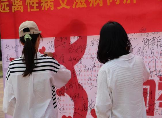 同时,为了增加宣传效果,9月23日,我校特别邀请黄骅市疾控中心李洪峰科长在学校一、二期生活区再次开展防艾宣传,并通过悬挂横幅、设立咨询台、宣传展板、发放宣传资料和防艾用品方式向同学们再次宣传艾滋病的防治知识。同学们就自己关心的问题向李科长进行现场咨询请教,加深了同学们对预防艾滋病相关知识的认识。志愿者们还组织了“向零艾滋迈进”的现场签名活动,吸引了众多同学积极参与。
