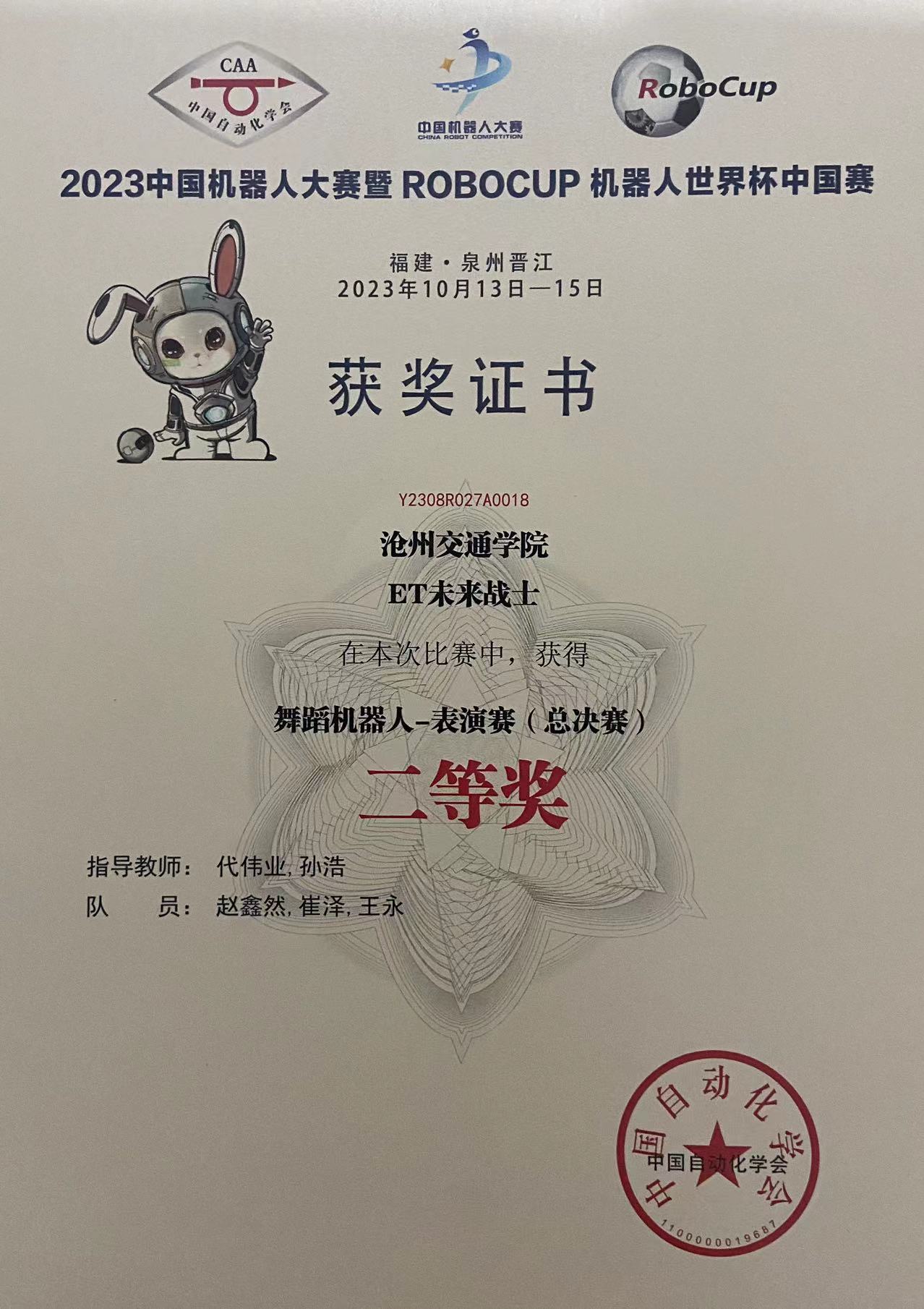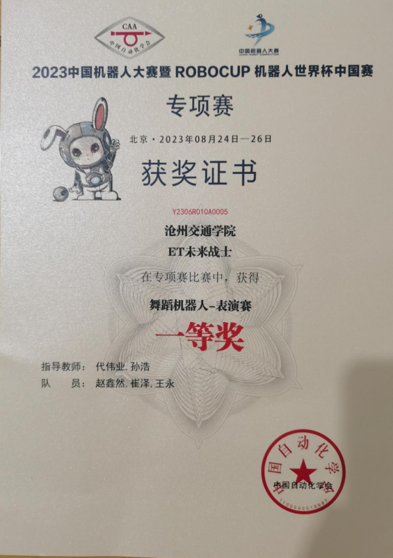 8月24日至26日在北京举行的中国机器人大赛暨RoboCup机器人世界杯中国赛专项赛中,我校机械与动力工程学院派出两支队伍参赛,分别是由赵鑫然、崔泽和王永三名同学组成的队伍以及王卓、葛岳硕和刘博森三名同学组成的队伍,指导老师代伟业和孙浩带领参赛。两支队伍分别荣获专项赛一等奖一项、优秀奖一项,其中获得专项赛一等奖的队伍被推荐至中国赛,于10月13日至15日在福建晋江参加中国赛荣获国家二等奖,实现了我校在该赛事上新的突破。