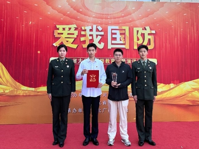 为加强当代大学生国防教育,深入学习贯彻习近平新时代中国特色社会主义思想特别是习近平强军思想,河北省开展以“爱我国防”为主题的大学生国防教育主题演讲比赛,让青年学子抒发矢志报国的壮志情怀。在本次大赛中,我校计算机与信息技术学院计算机科学与技术2206班索冉、计算机科学与技术2106班韩子诚、机械与动力工程学院车辆工程2201班王钰博参加比赛并成功入围决赛,最终荣获三等奖。