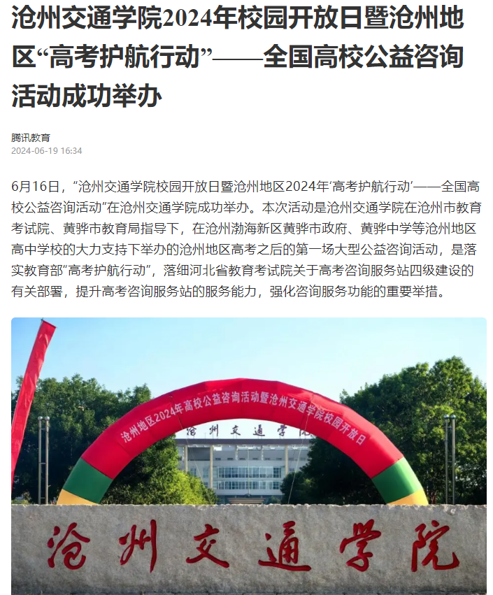 近日,河北卫视《你好京津冀》、河北公共频道《新闻6号线》、腾讯教育、中国教育在线、凤凰教育等主流媒体报道我校2024年校园开放日暨沧州地区全国高校公益咨询活动。