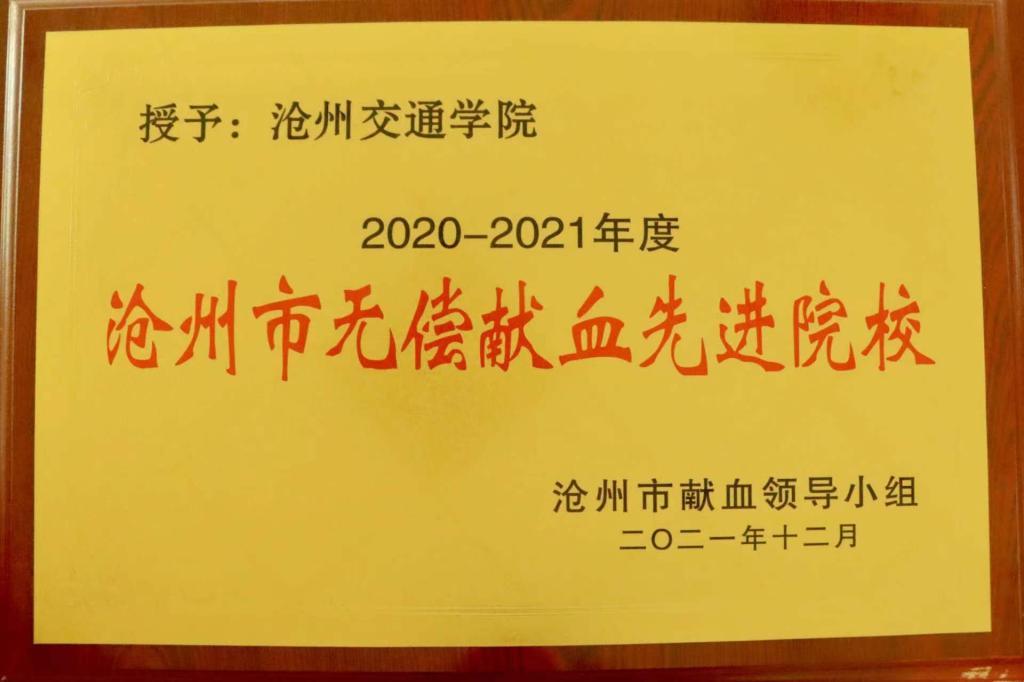 我校自2012年成立无偿献血志愿服务分队以来,共有7000余人次累计献血200万余毫升。期间,我校荣获多项荣誉:2014-2015年度河北省无偿献血促进奖高校奖、2016-2017年度全国无偿献血促进奖单位奖、2016-2017沧州市无偿献血先进高校、2018-2019年度沧州市无偿献血先进院校、2020-2021年度全国无偿献血促进奖特别奖、2020-2021沧州市无偿献血先进院校、2022-2023年度沧州市无偿献血先进院校。在无偿献血的志愿服务中,志愿者们在社会各界留下了属于沧交的奉献足迹。