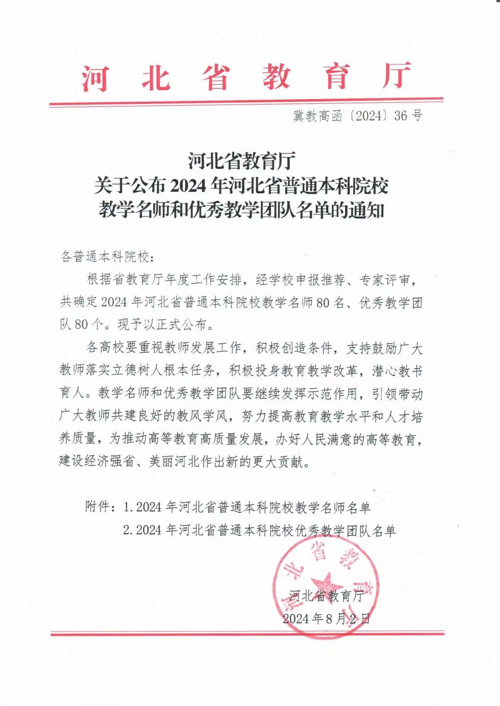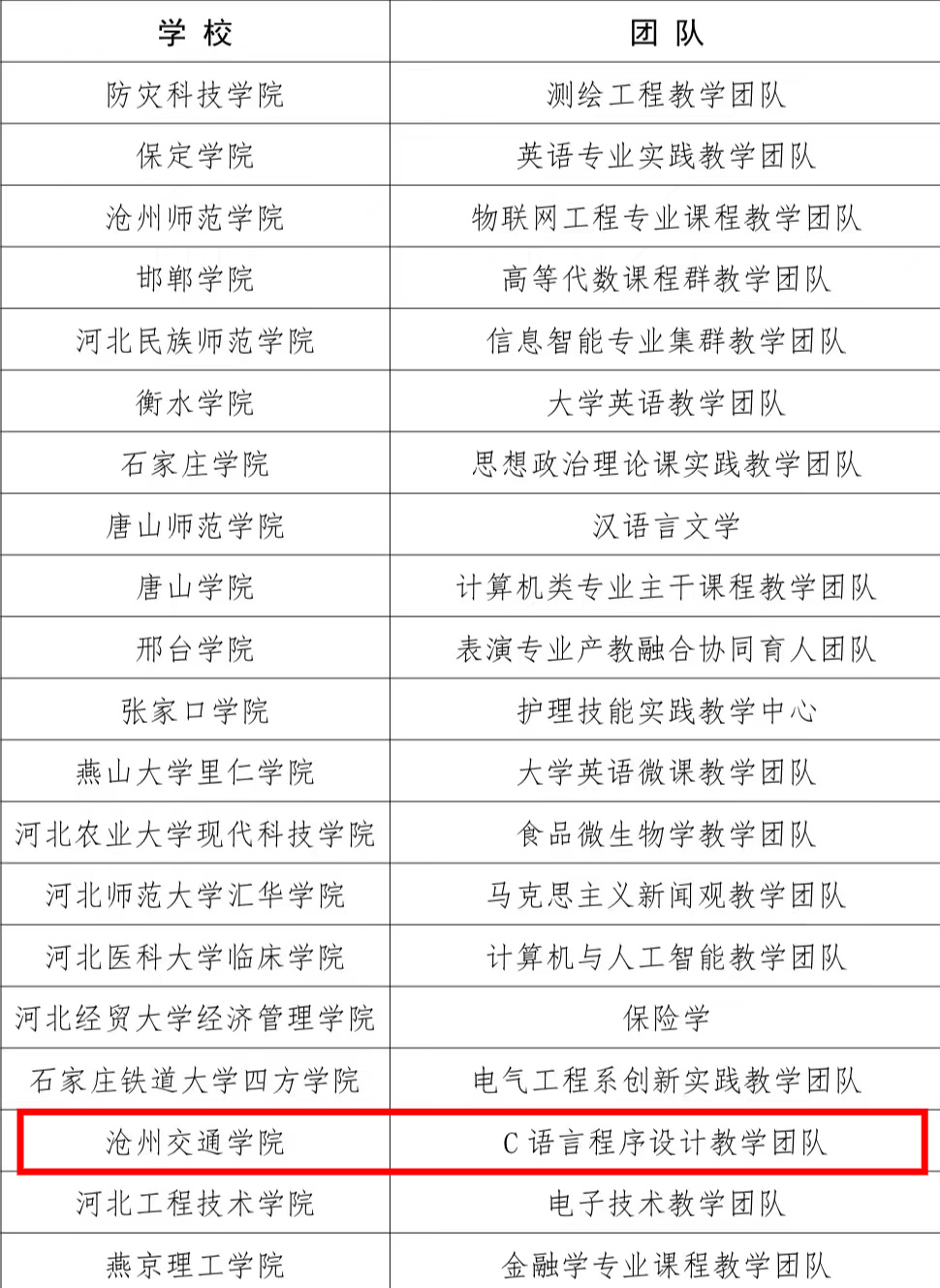 8月2日,河北省教育厅发布了《关于公布2024年河北省普通本科院校教学名师和优秀教学团队名单的通知》(冀教高函〔2024〕36号),我校计算机学院尹鸿峰副教授带领的“C语言程序设计教学团队”荣获2024年度河北省普通本科院校优秀教学团队。