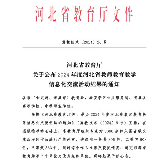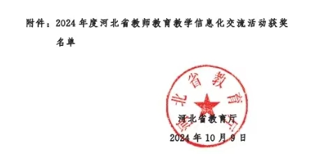 近日,河北省教育厅公布了河北省2024年度教师教育教学信息化交流活动评选结果,我校共推荐20件作品,8件获奖。其中二等奖4件,三等奖4件。